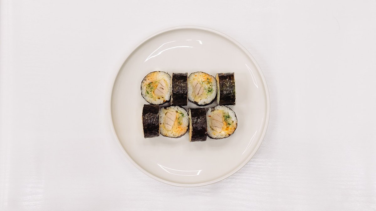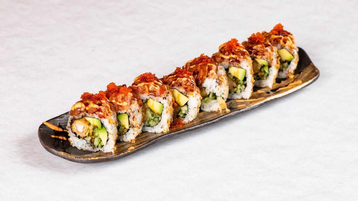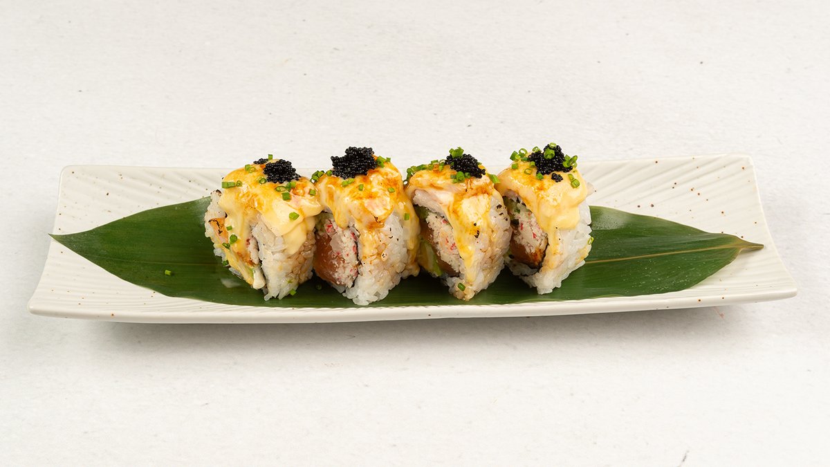 Uvnitr: tempura krevety, krabí, avokádo a okurka. Venku: kaviár, cibule, unagi a snehova omáčka.