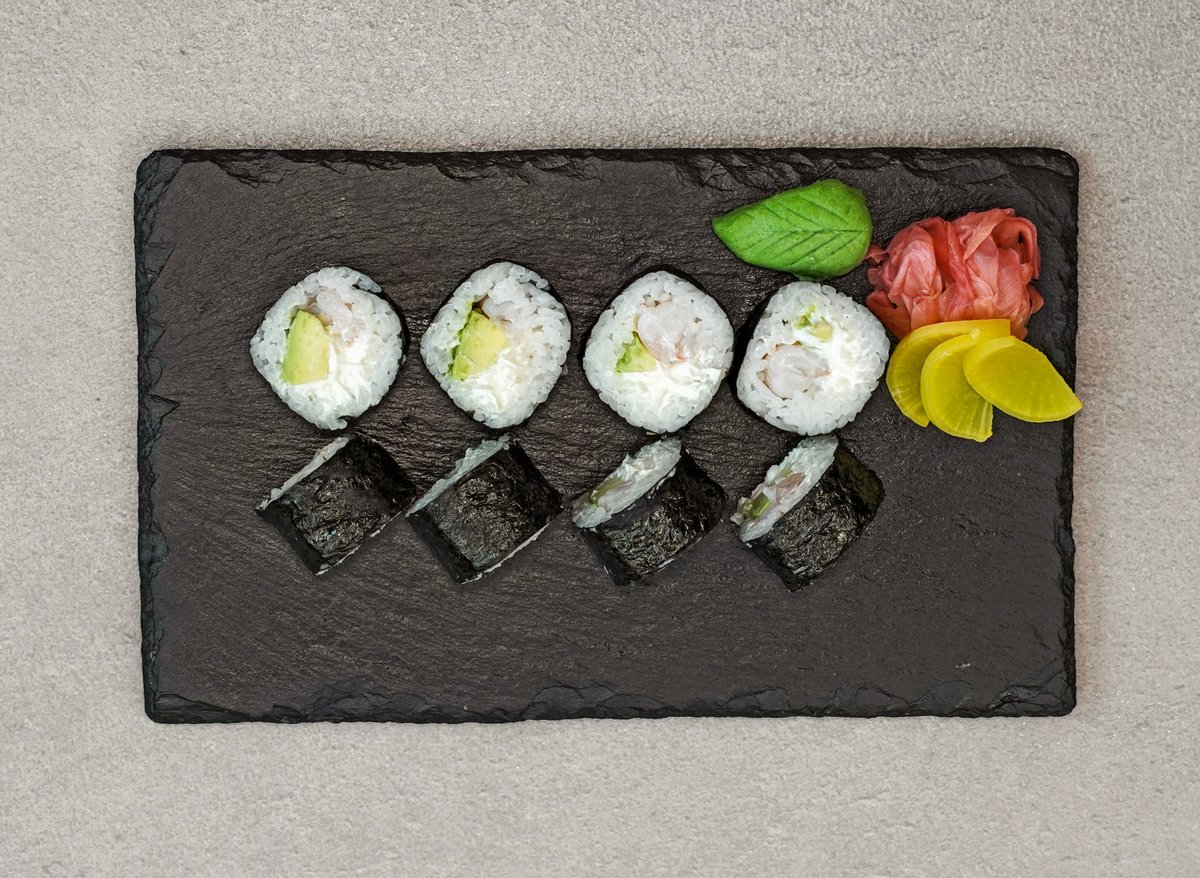 Krevety, avekádo, okurka, sýr, kaviár unagi, sněhová omáčka a kaviár.