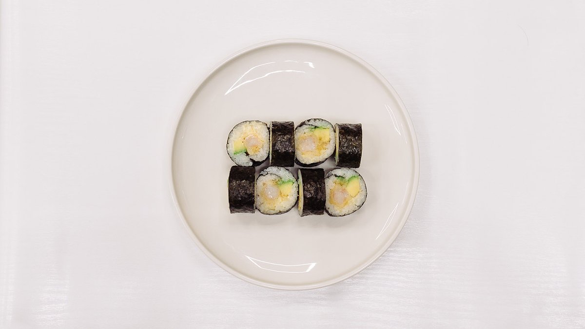 Krevety, avokádo, tobiko, mořské řasy a rýže.