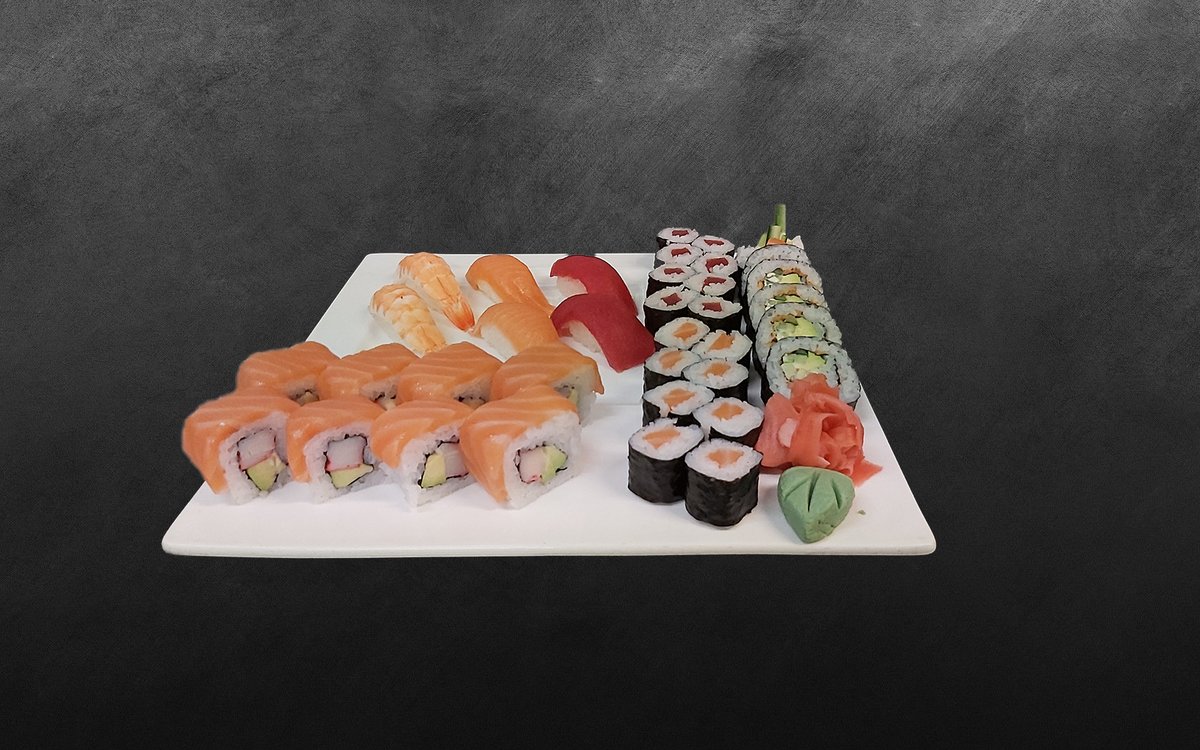 6ks sashimi: sake, maguro, 6ks nigiri: avocado, tako, ebi, 8ks maki kani, 8ks maki kappa, 10ks futomaki tempura krevety ebi a 8ks dragon roll flambéed. (fotka je ilustrativní)