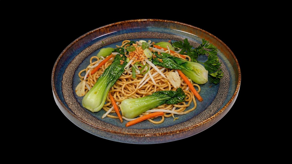 Smažené nudle, pak choi, mrkev, česnek, sójové klíčky a maso dle výběru.