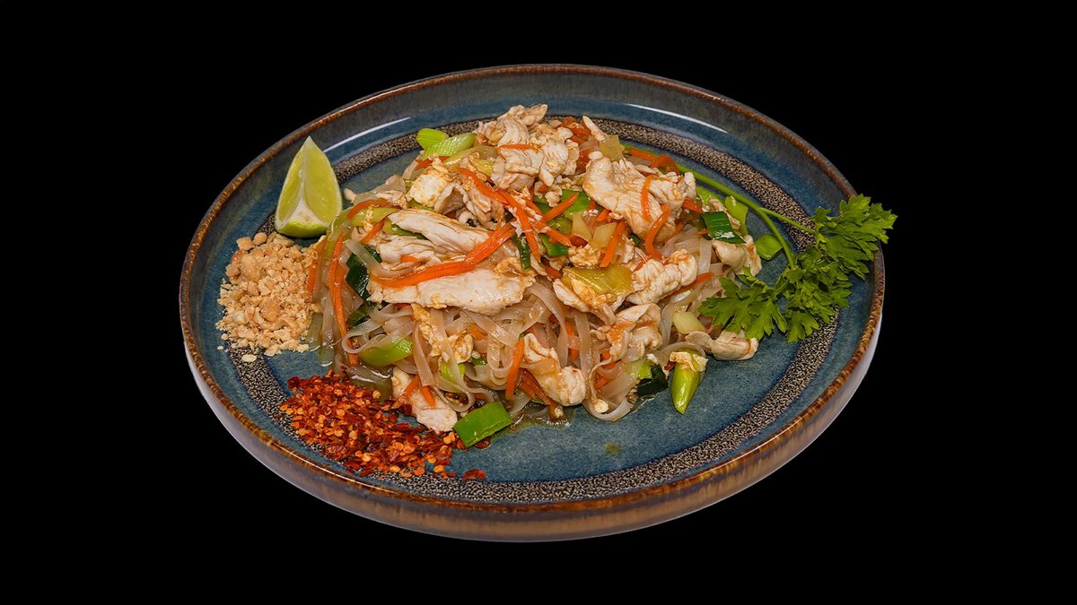 Populární thajské nudle se zeleninou, masem dle výběru (thajské rýžové nudle, mrkev, pórek, sójové kličky a vejce. Podáváme s chilli, arašídy a limetkou).