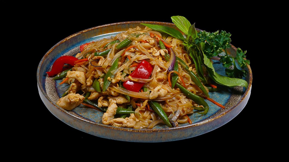 Smažené thajské nudle, roštěné maso, mrkev, paprika, bazalka, fazolové lusky, vejce, chilli a maso dle výběru.