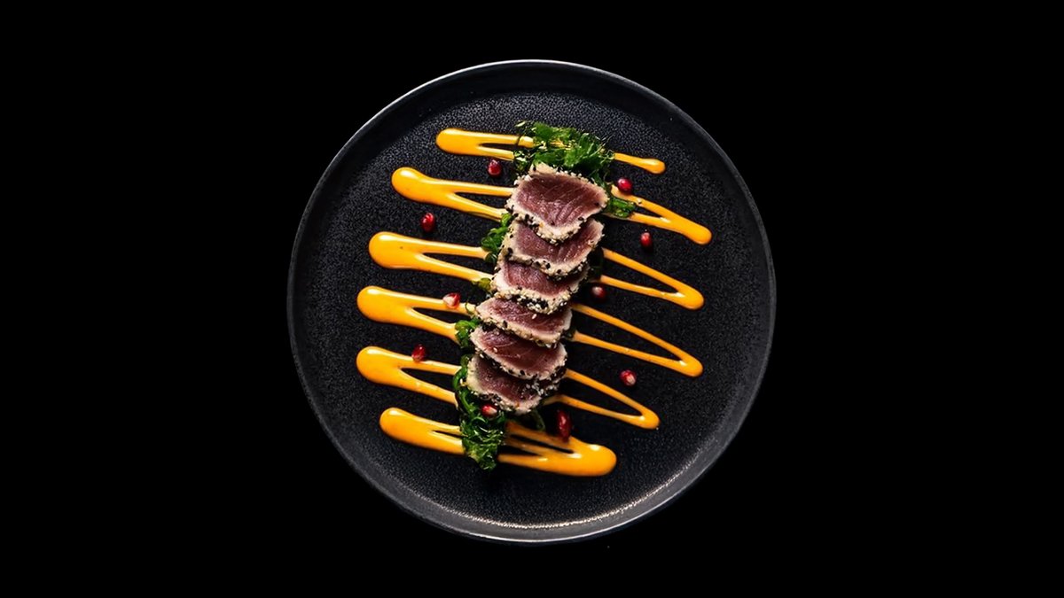 Čerstvé plátky tuňáka na řasovém salátu se sezamem.