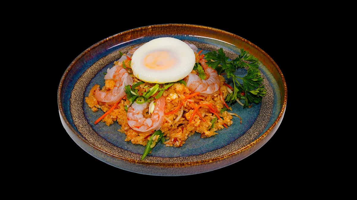 Asijská smažená rýže s masem a sázeným vejcem (jasmínová rýže, vejce, červená cibule, mrkev, červená paprika, fazolové lusky, smažená cibulka, jarní cibulka, koriandr a chilli).
