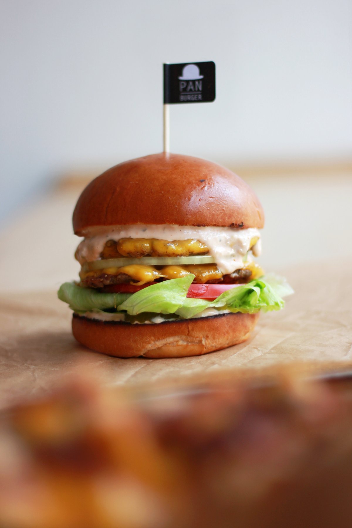 2 tenká (SMASH) hovězí masa, čedar, salát, rajče, okurek, grilovaná cibule, In-n-Out sauce
