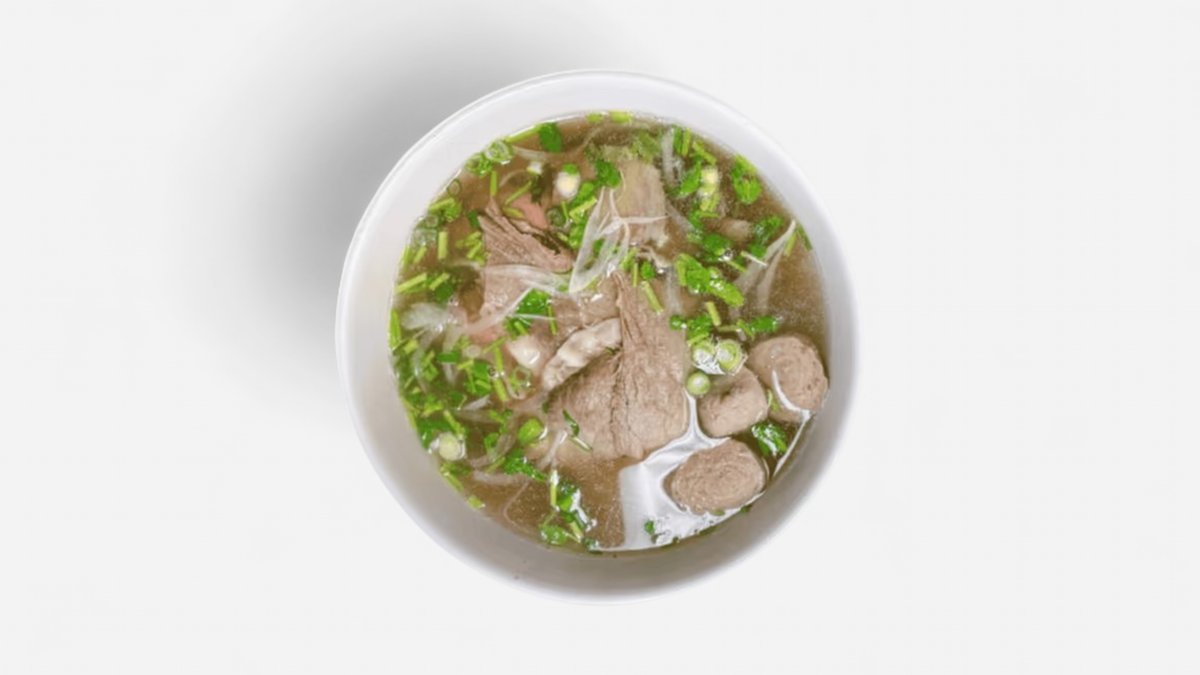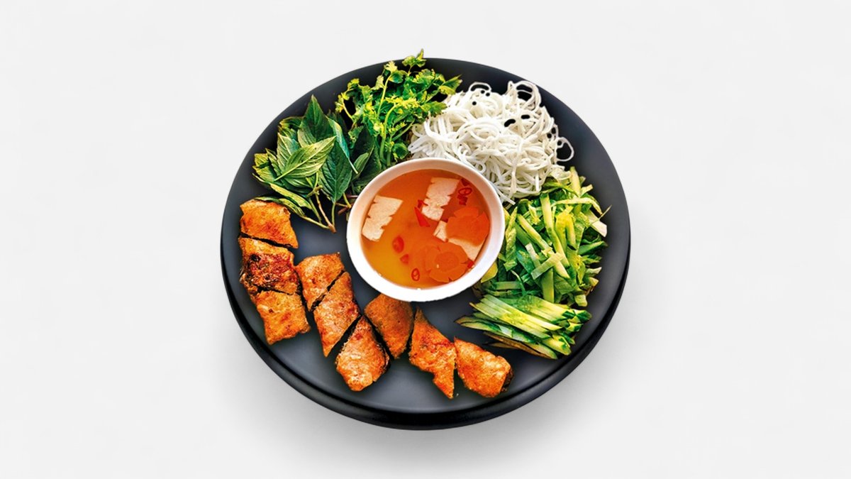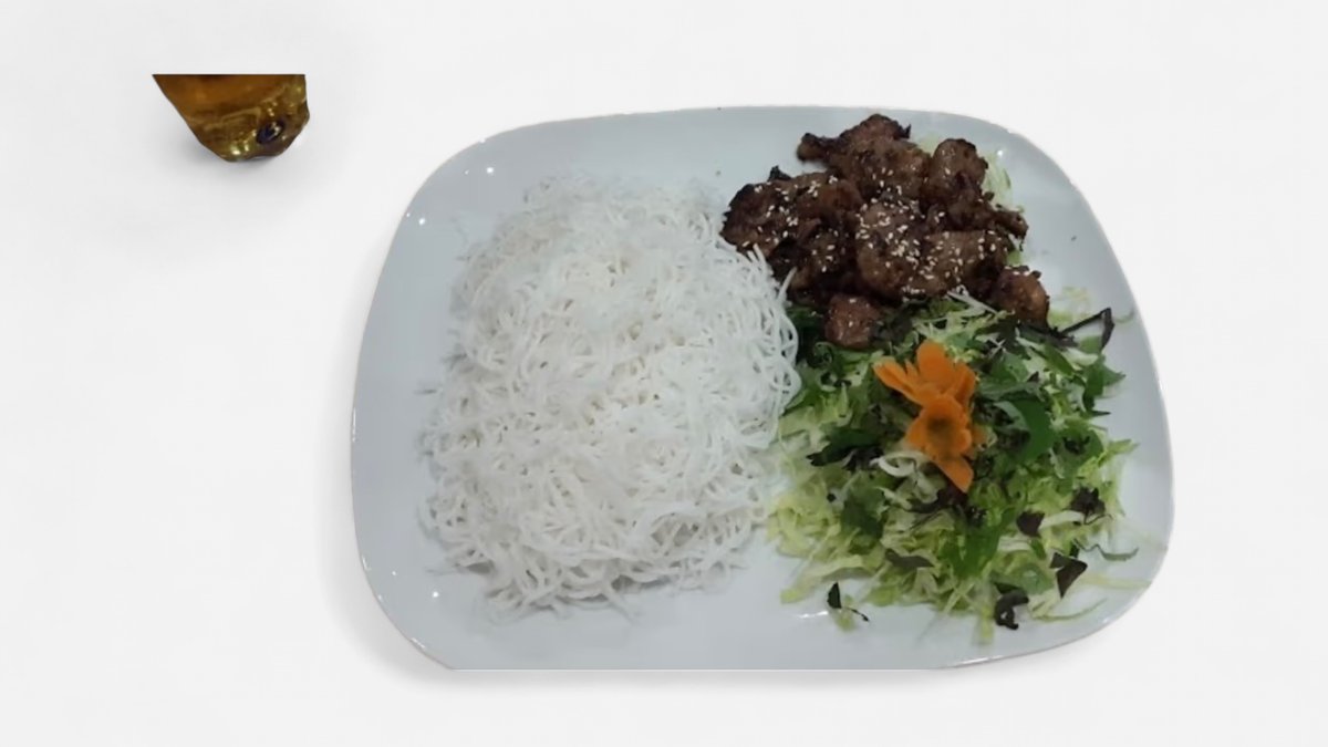 Ryzovy Nudle s grilovaným vepřovým masem, salát, koriandr.