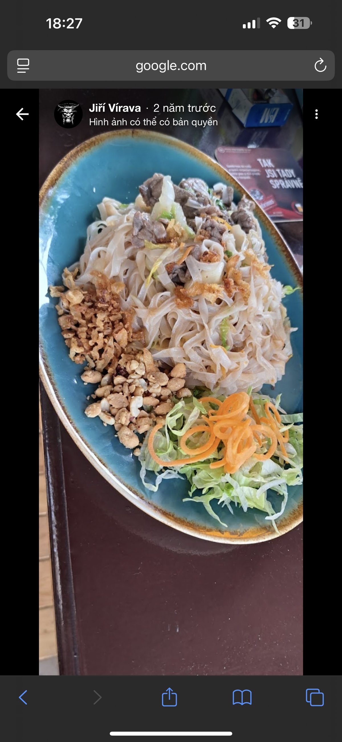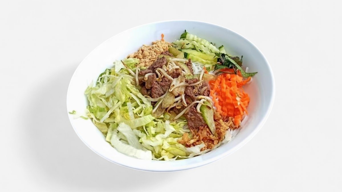 Nudle se smaženým hovězím masem, arašídy, mrkev, okurka, salát, cibulka, koriandr.