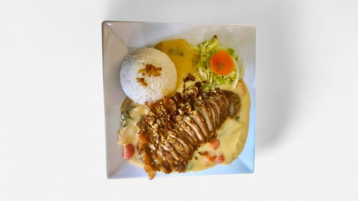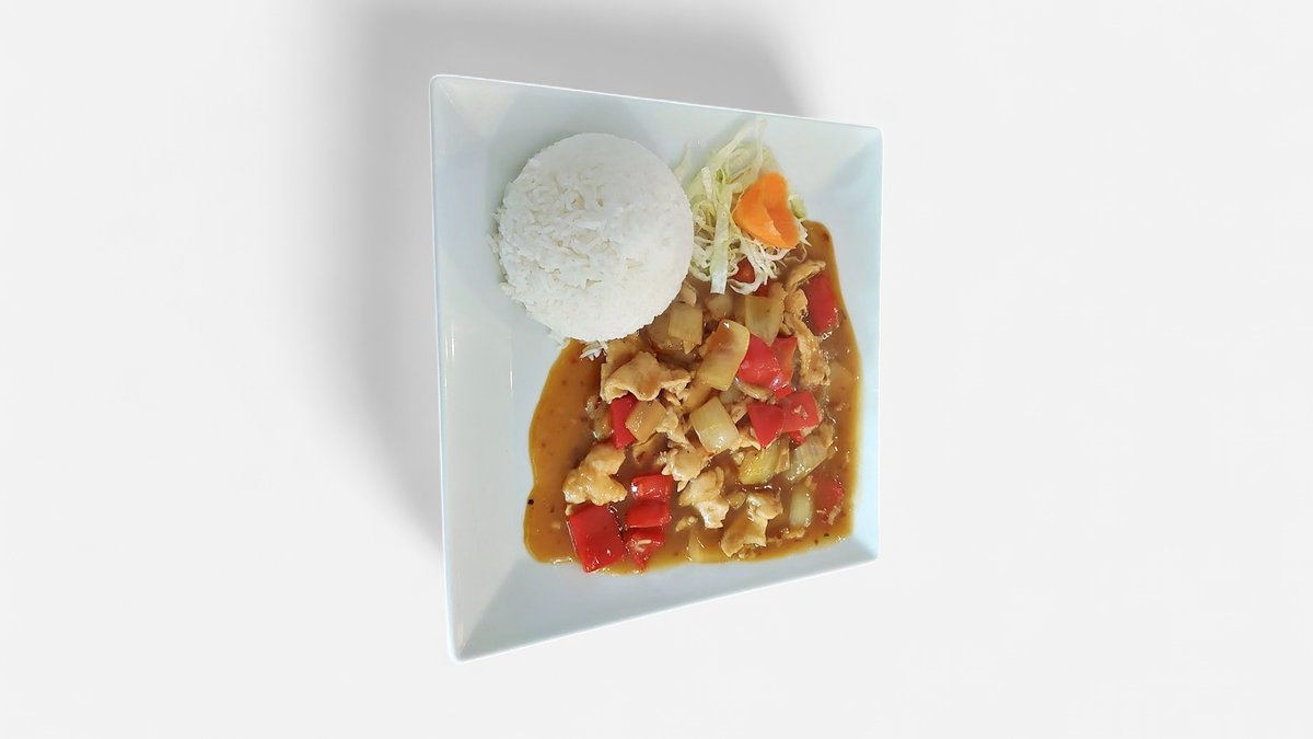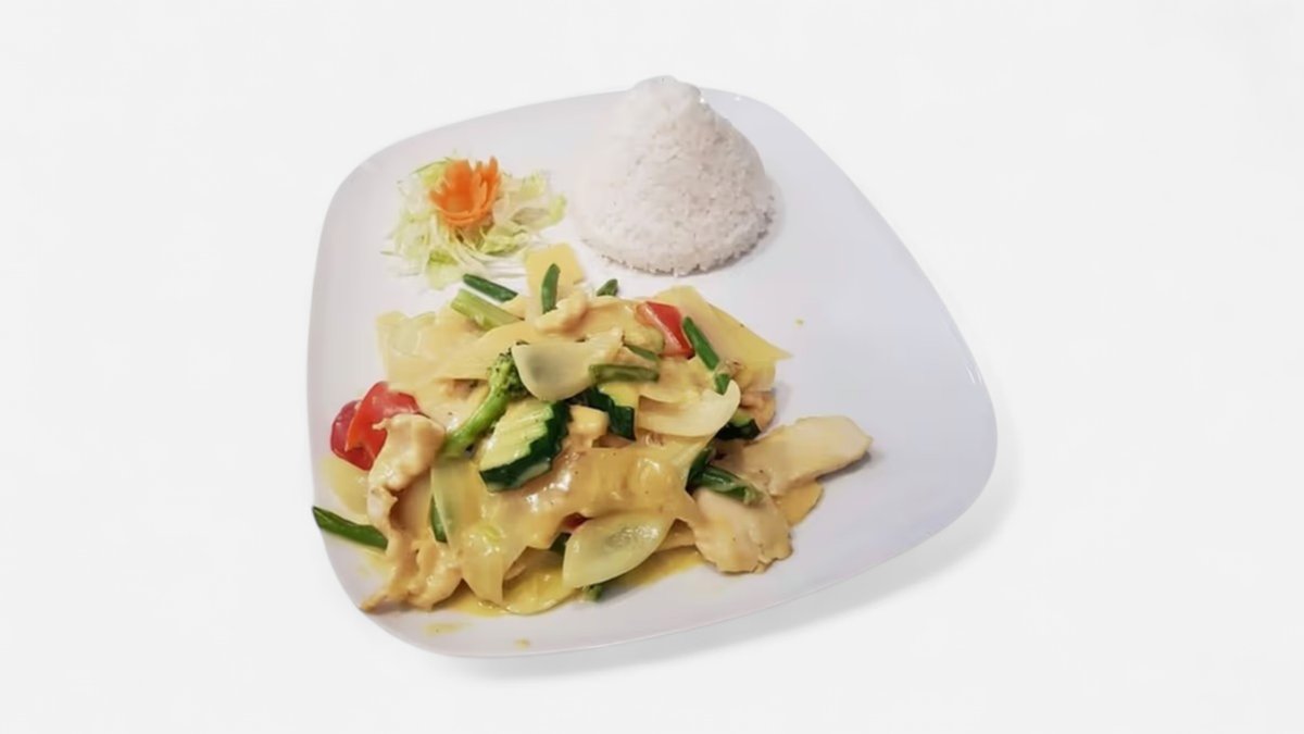 (7,12) Zlute kari s masem a zeleninou + rýže.