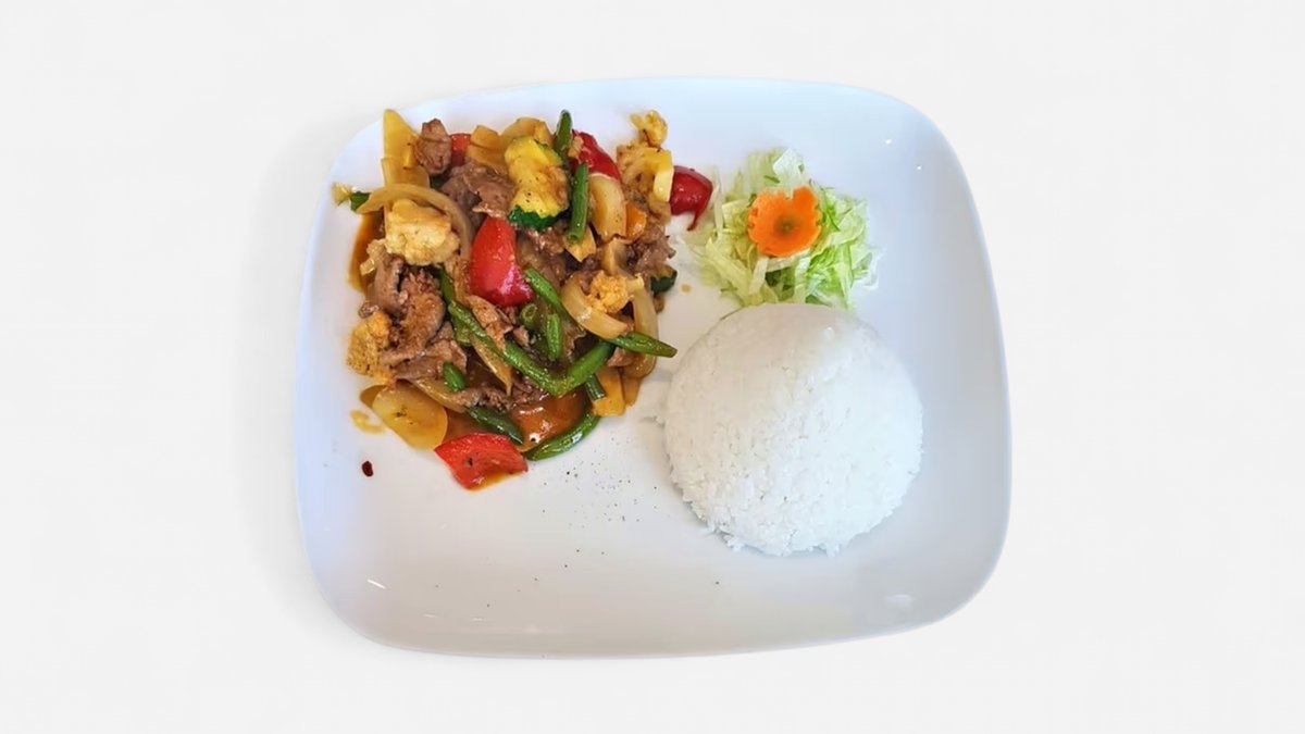 (11) Hovězí maso restované s houbami a fazolovými klíčky + rýže.