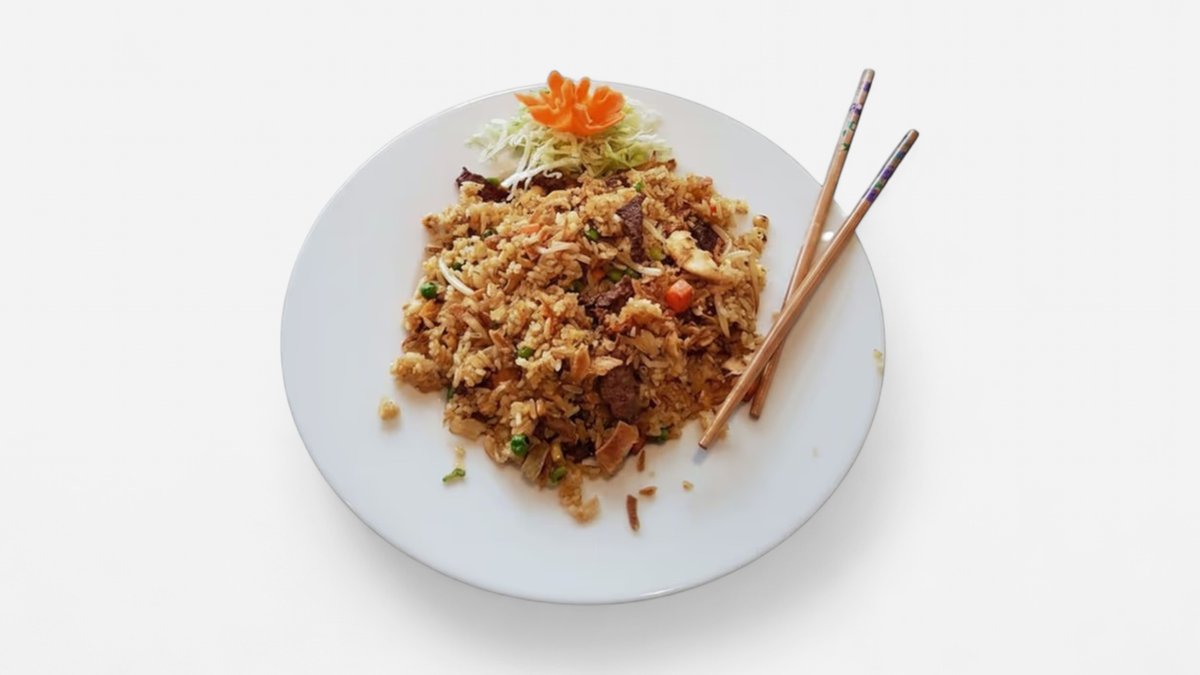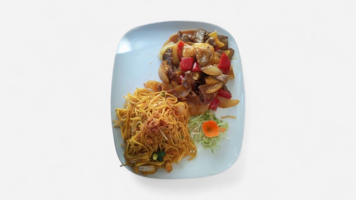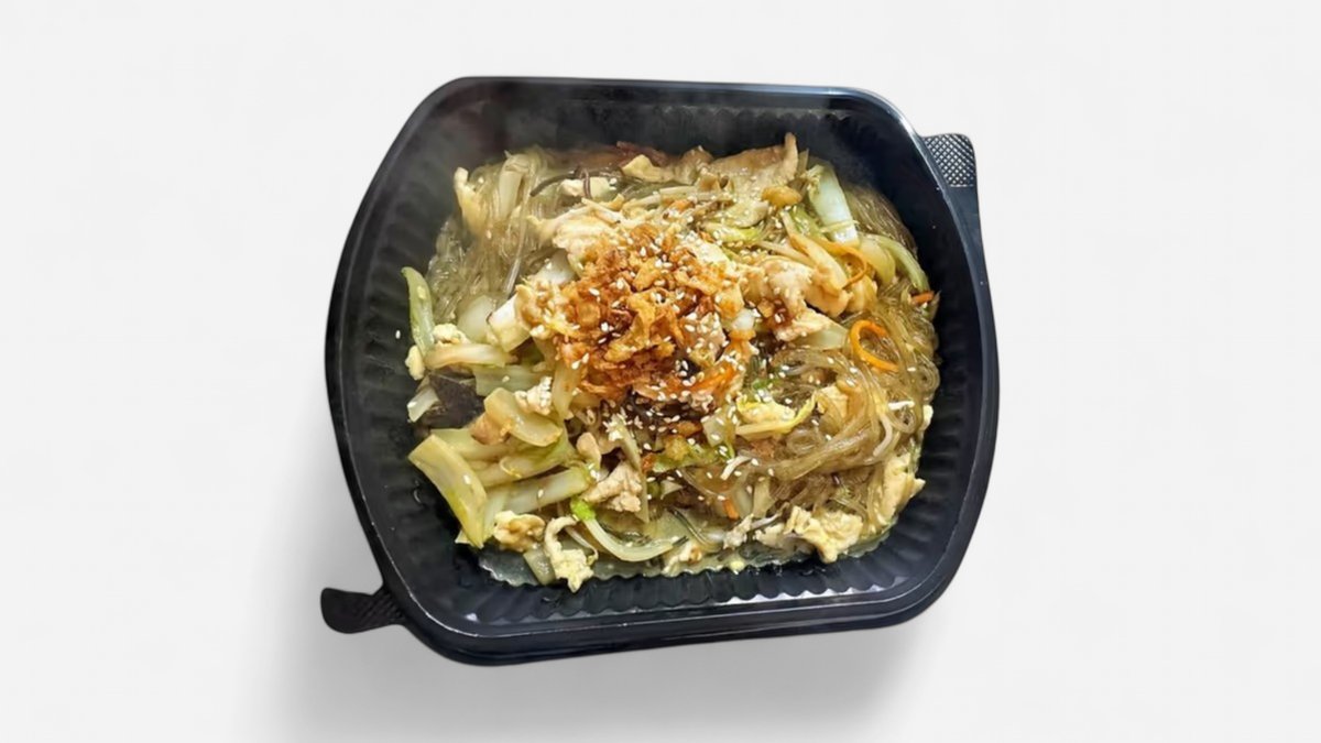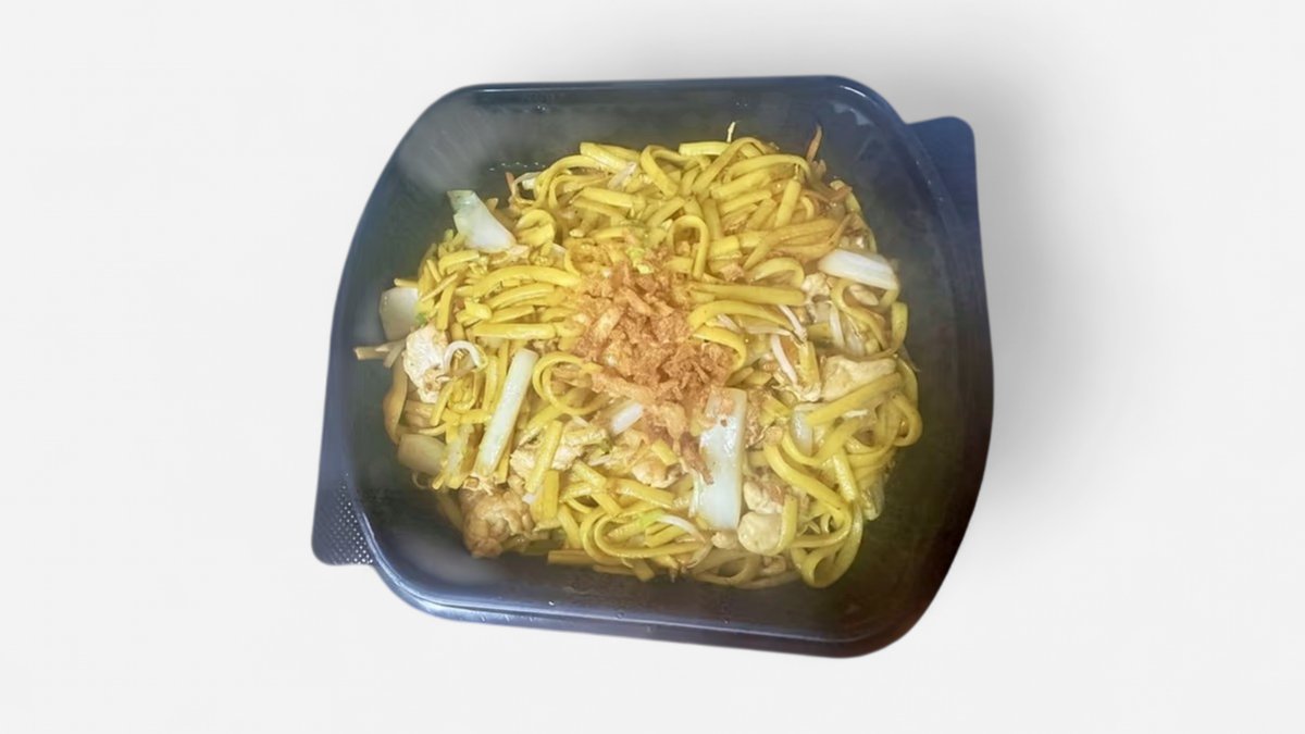(2,3,11) Restované rýžové nudle s masem a zeleninou.