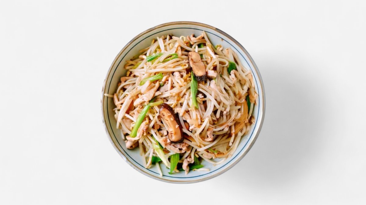 (11) Kuřecí maso restované s mungo klíčky a houbami + rýže.