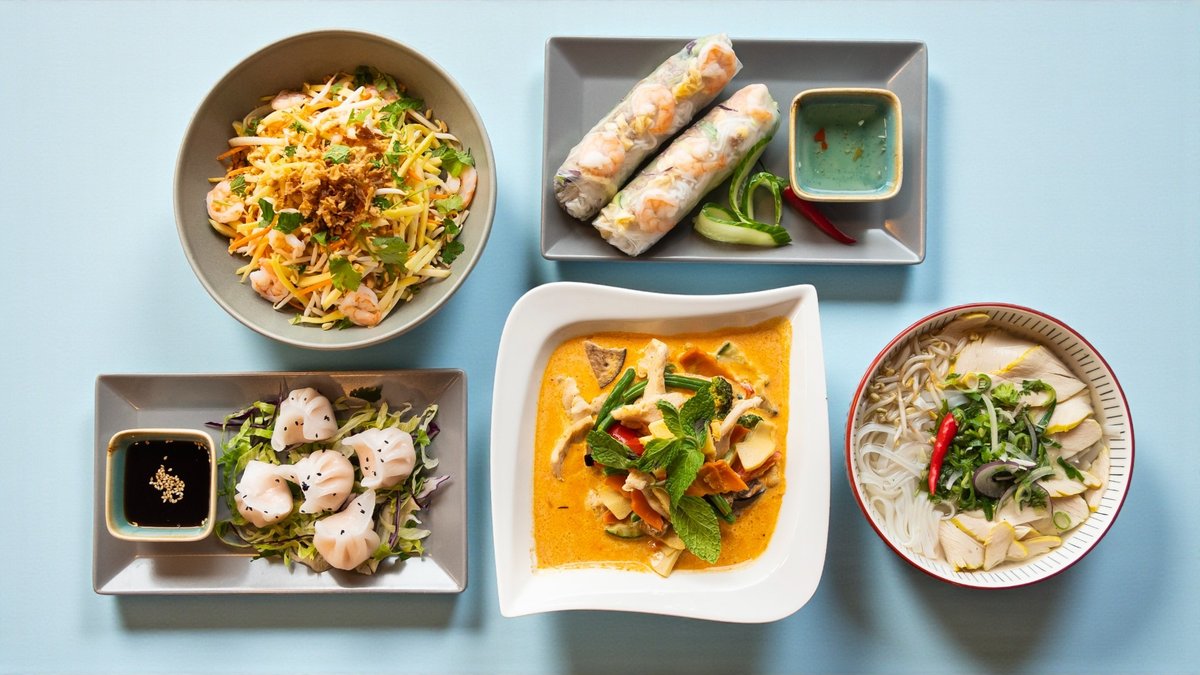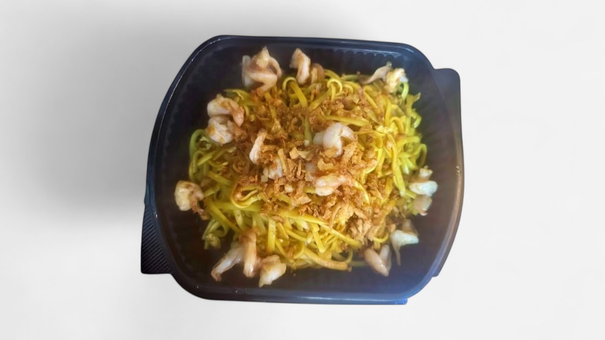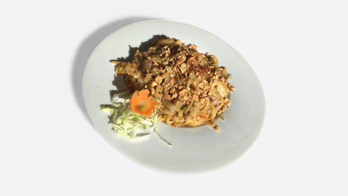 Míchané ploché nudle s kokosovým mlékem, krevety, kuřecí maso, salát, koriandr a arašídy.
