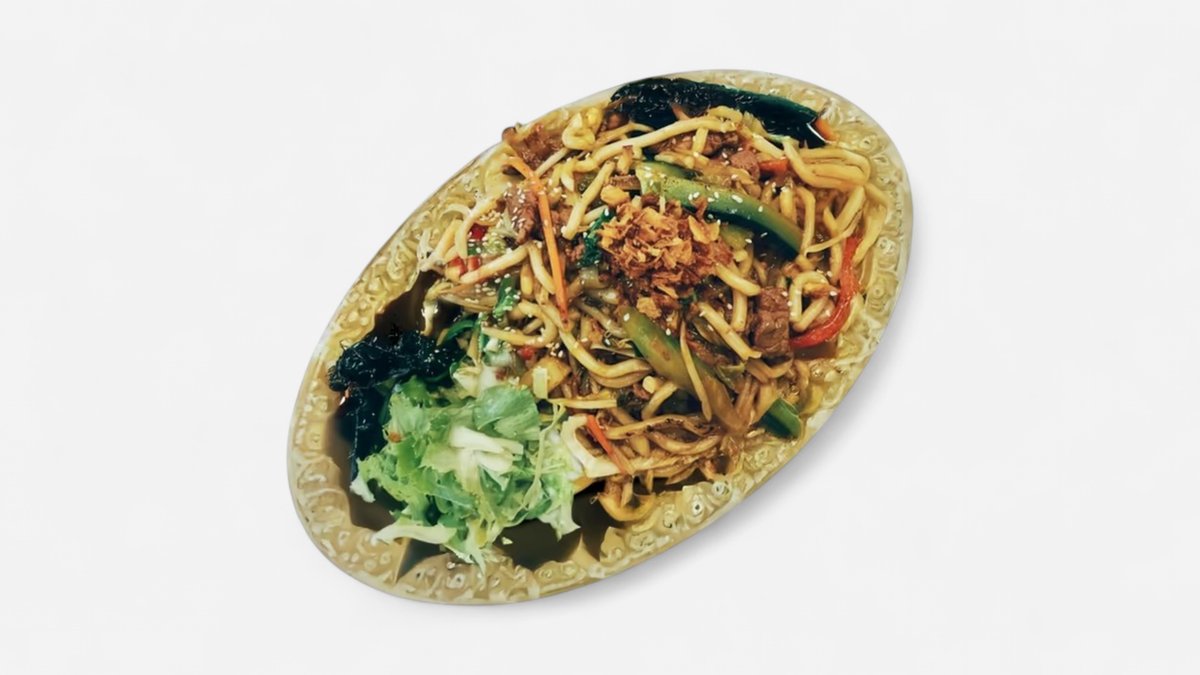 (1,3,9,11) Restovaný udon s masem a zeleninou.
