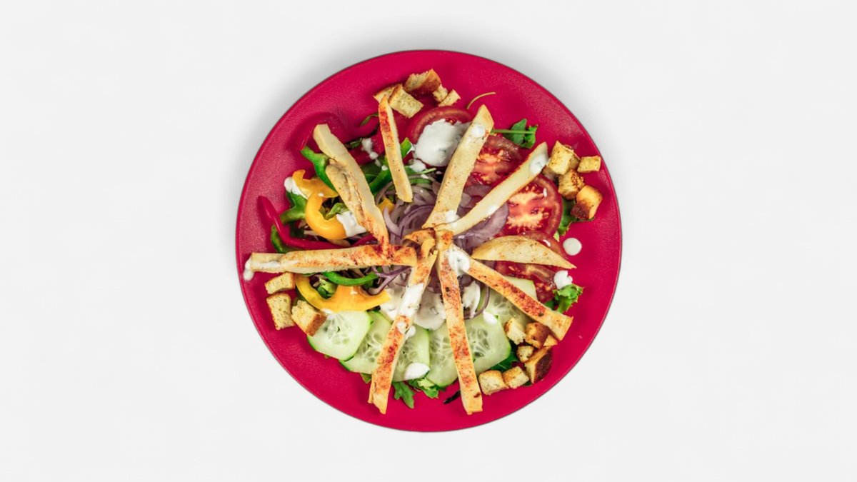 Kuřecí salát s maracujovou omackou, červená paprika, okurka, rajčata.