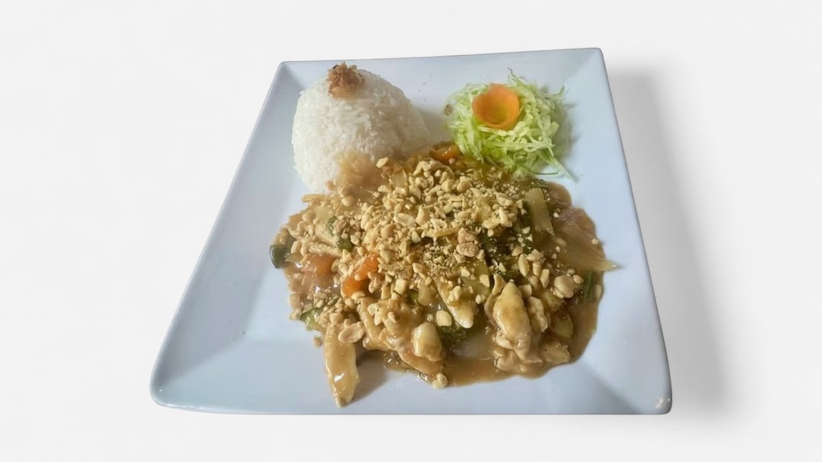 (8,11) Kuřecí maso restované s kešu + rýže.