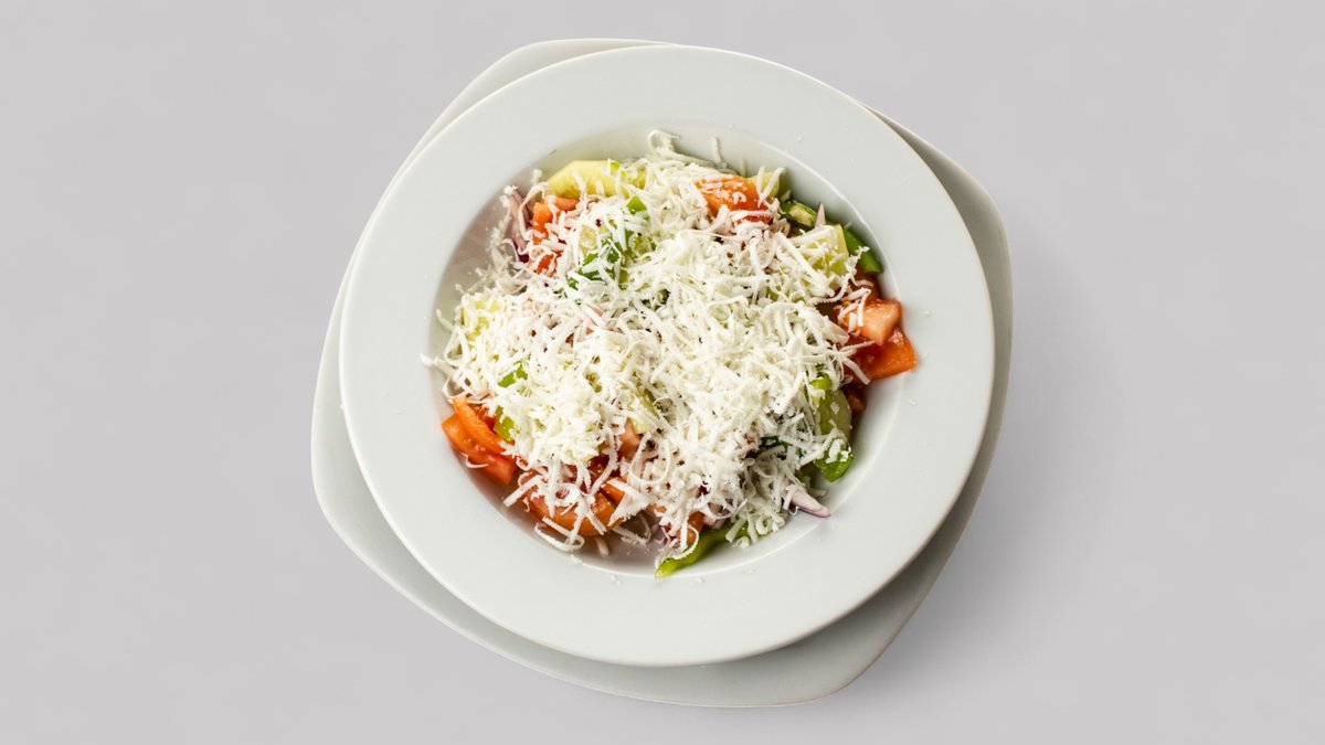 Ledový salát, rajčata, okurky, cibule, dressing, sýr