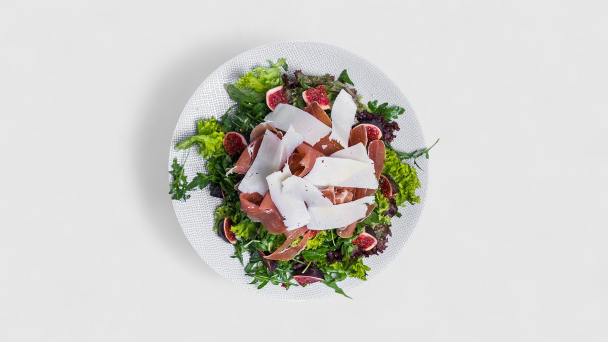 Parmská šunka, variace listových salátů a čerstvé zeleniny, sušená rajčata, extra panenský olivový olej, hoblinky parmezánu