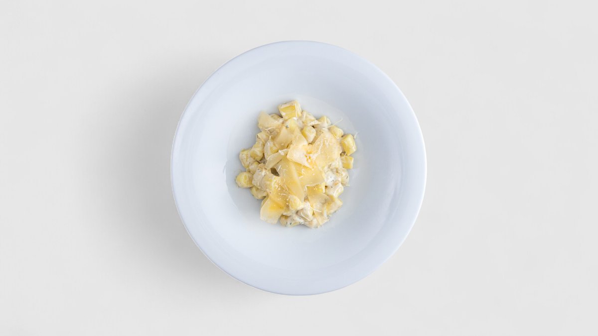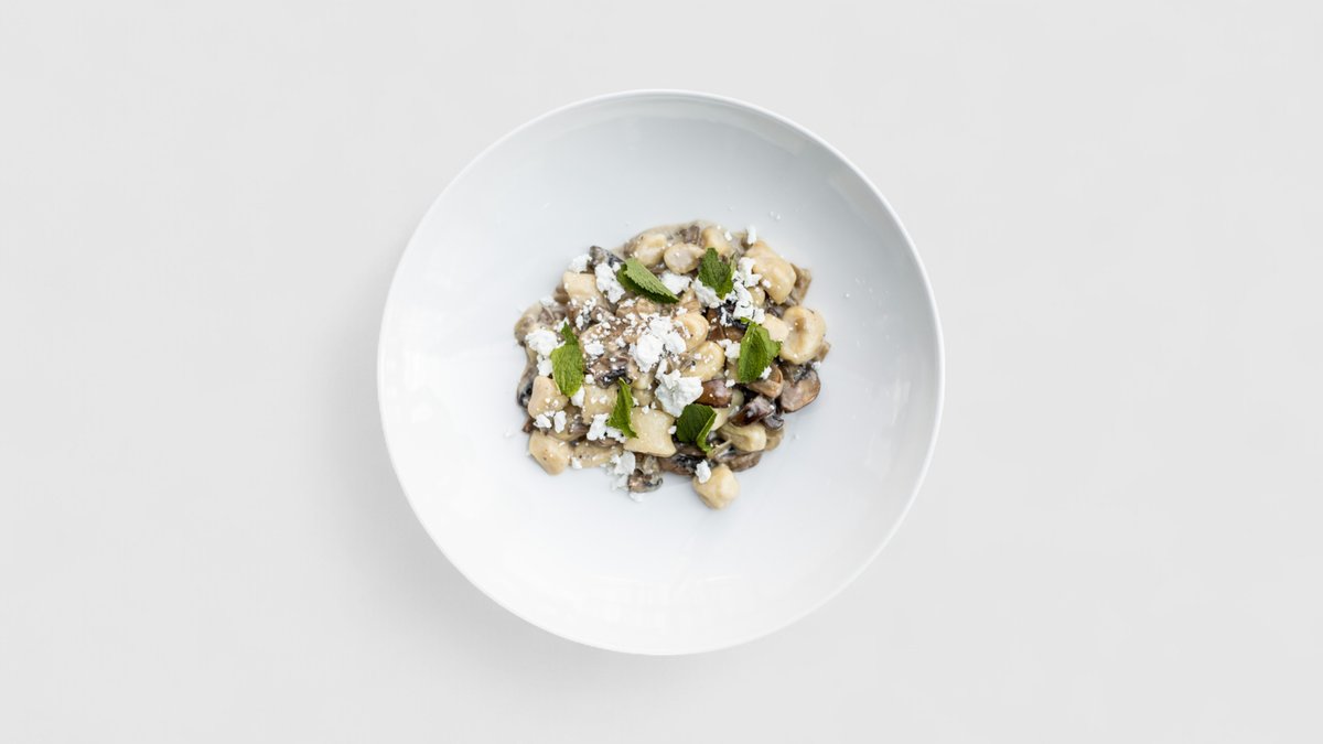 Restované kousky vepřové panenky, hříbková omáčka, parmezán