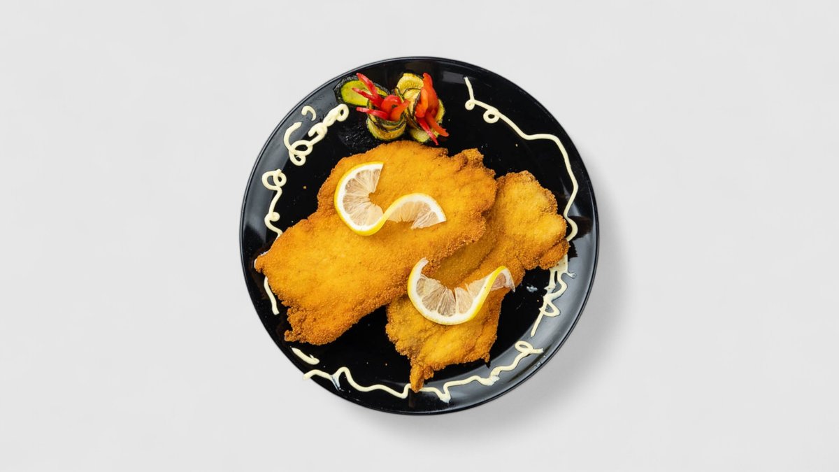 150g vepřového masa, sýr čedar, slanina, cibule, rajče, salát, majonéza, hranolky nebo zeleninový salát