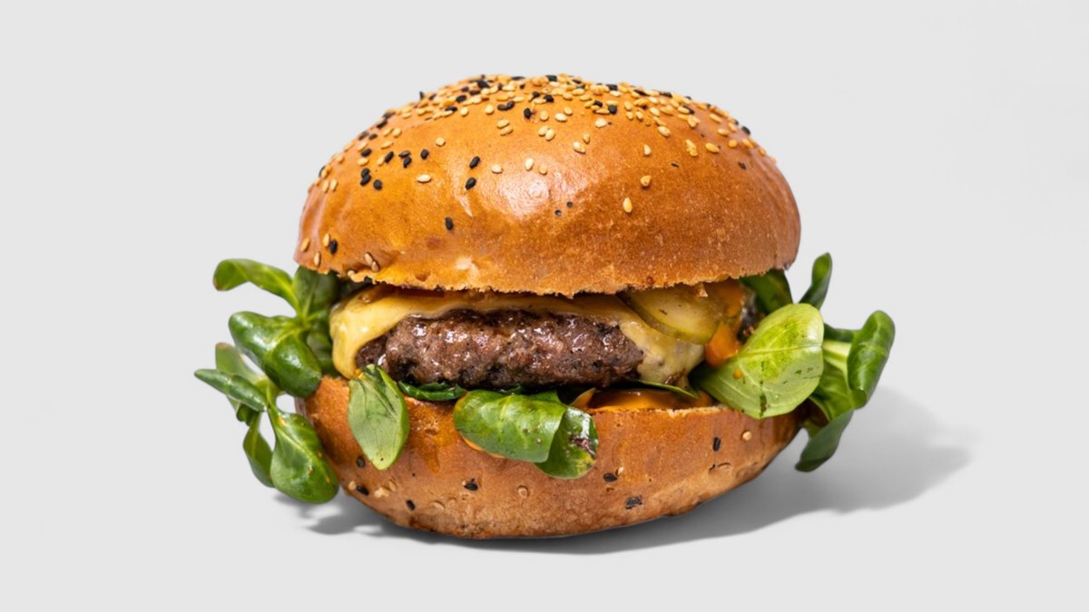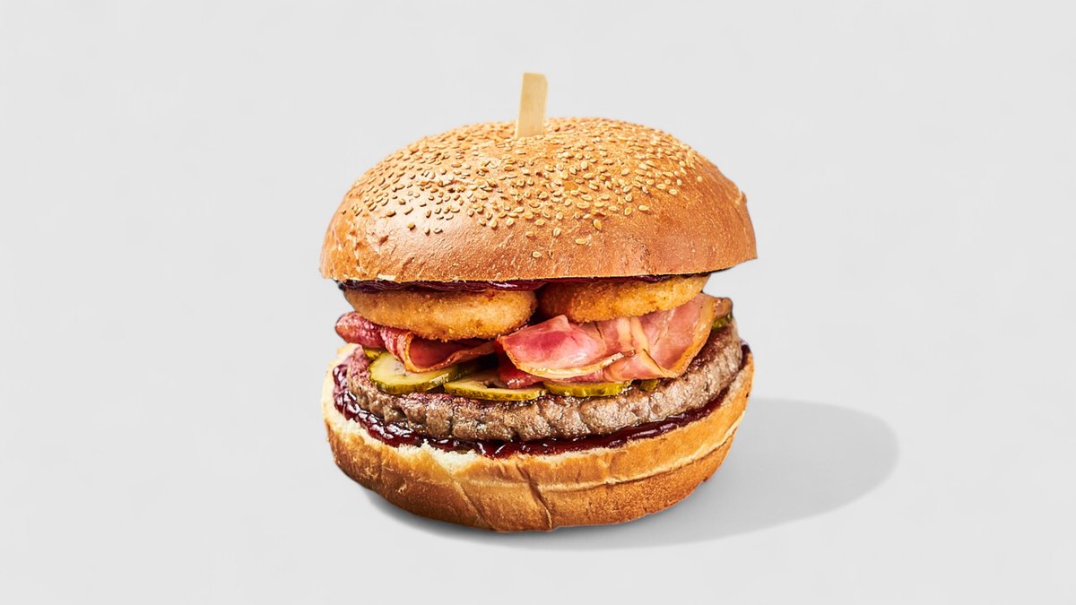 Nadýchaná bulka s posypem, domácí slaninová majonéza, rajče, salát, hovězí maso, dvojitá porce čedaru a domácí cibulové kroužky