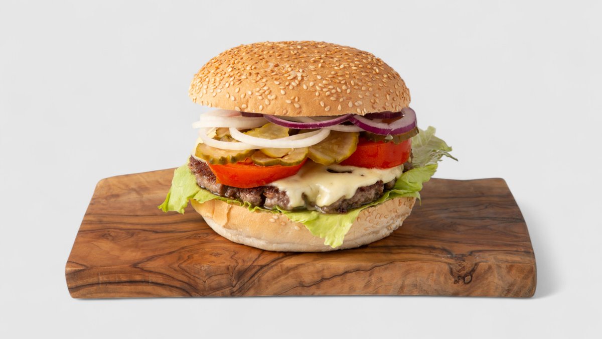 150g domácího hovězího masa, sýr čedar, nakládaná okurka, cibule, rajče, salát, majonéza, chilli omáčka, hranolky nebo zeleninový salát