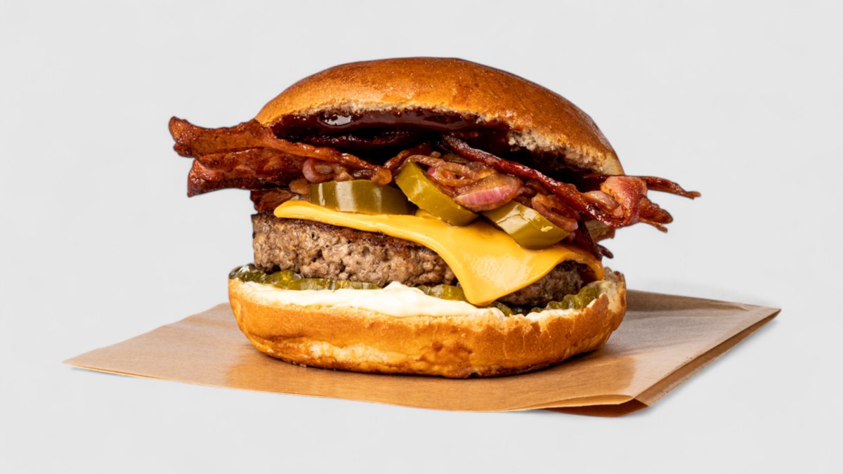 150g domácího hovězího masa, sýr čedar, slanina, cibule, jalapeños, rajče, salát, majonéza, hranolky nebo zeleninový salát