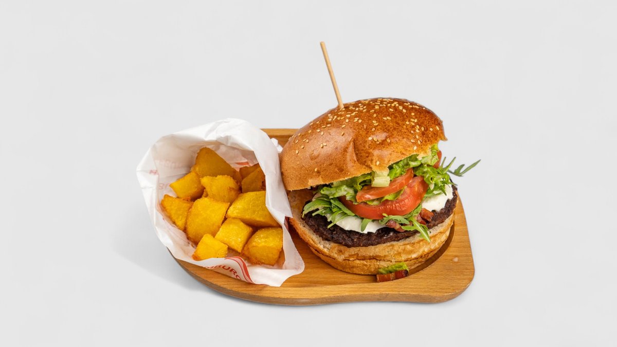 150g domácího hovězího masa, sýr čedar, mozzarela, cibule, rajče, salát, majonéza, hranolky nebo zeleninový salát