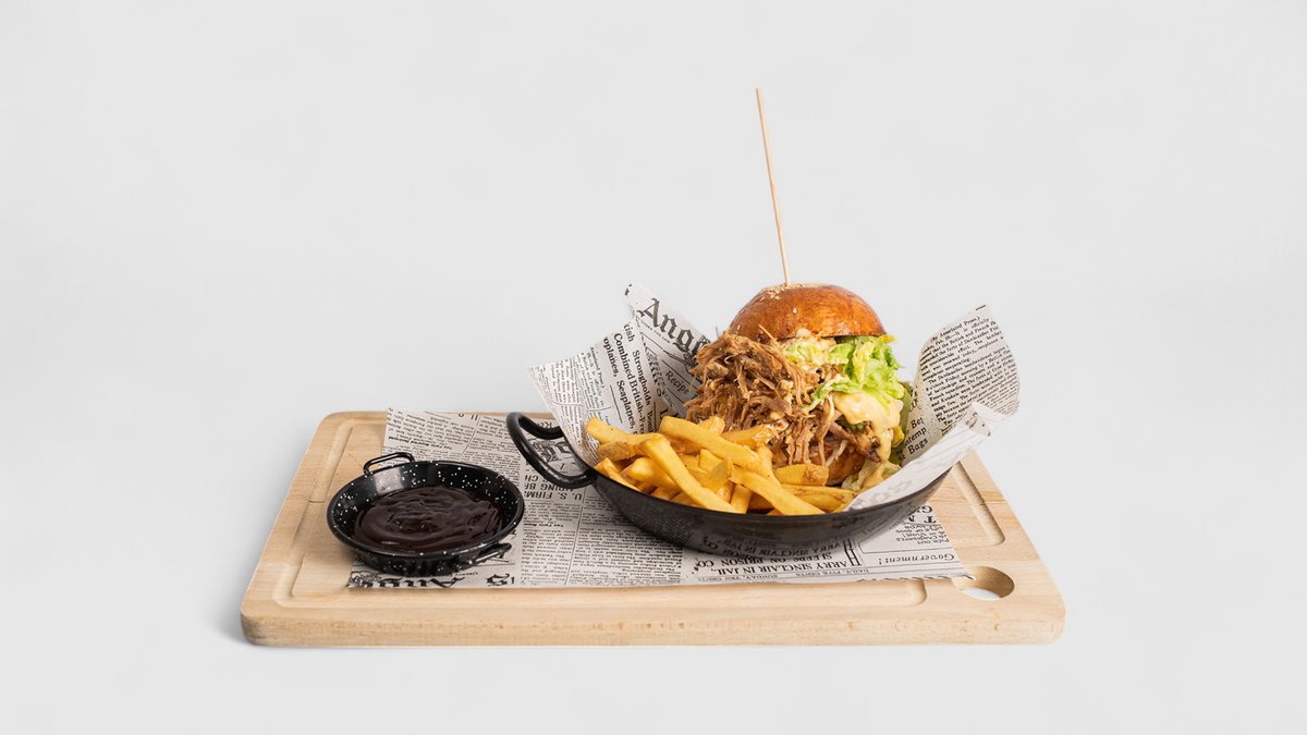 150g vepřového masa, sýr čedar, slanina, cibule, jalapeños, rajče, salát, majonéza, hranolky nebo zeleninový salát