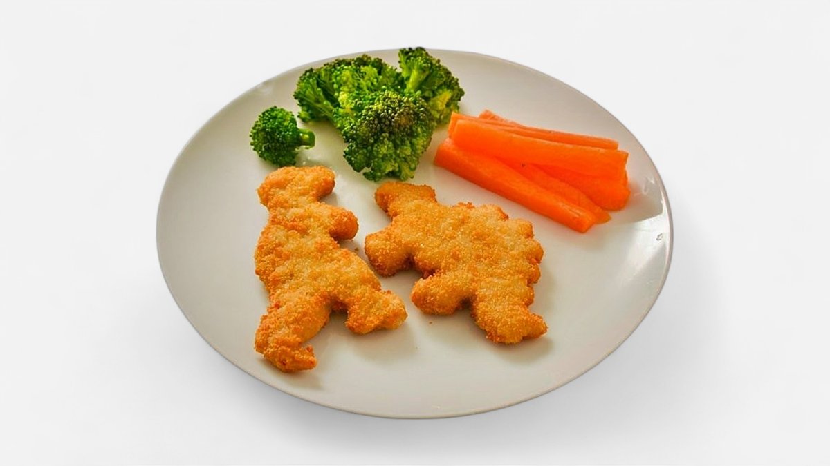 Smažené kuřecí nugetky ve tvaru dinosaurů na talíři