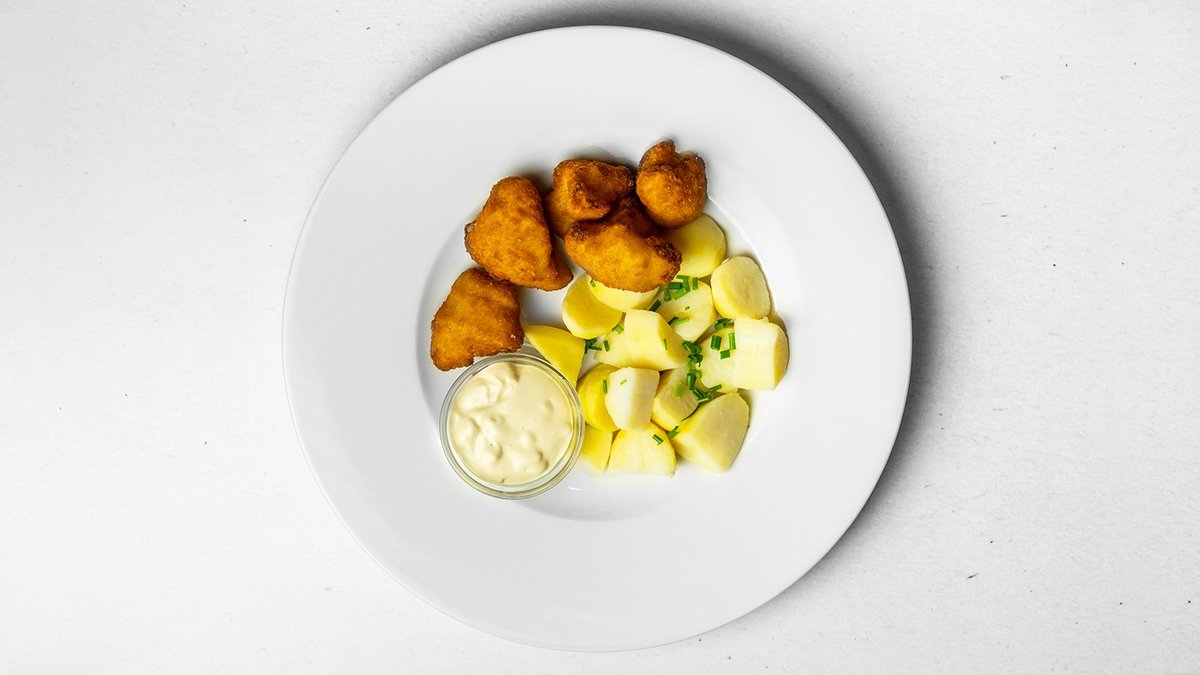 smažený sýr gouda s vařenými brambory a domácí tatarskou omáčkou