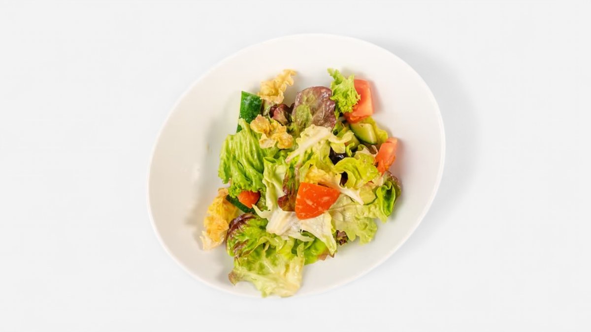zeleninový salát, sýr, okurky, rajčata, olivy a dresink