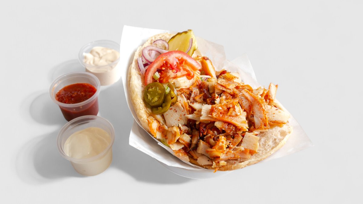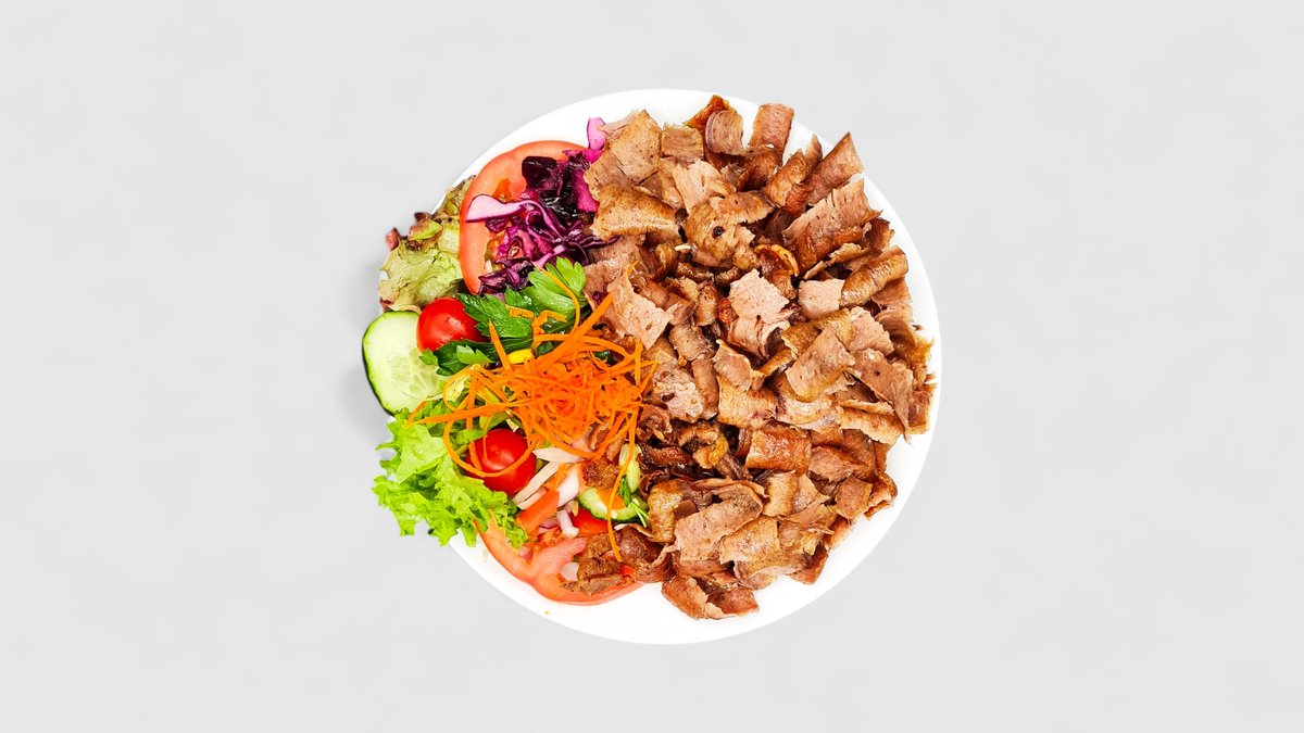 Hovězí maso, zelenina, salát, kyselá okurka, dresink, pita chleba