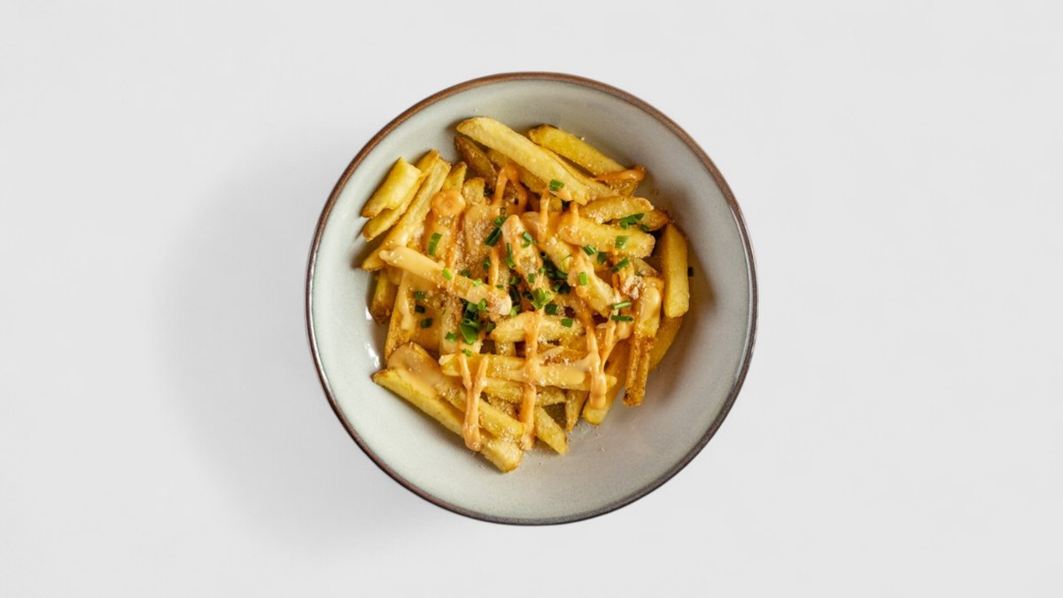 Hovězí maso, salát, čedar, hranolky kyselá okurka, dresink