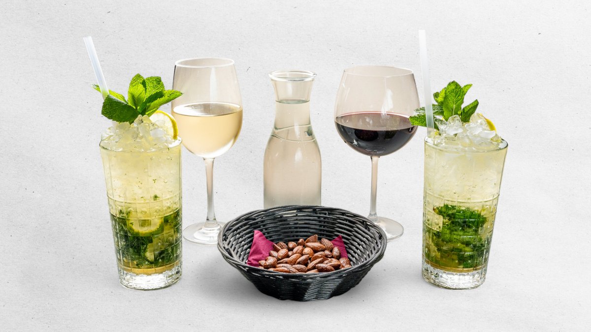 Lahev vína dle výběru (Chardonnay, Pinot Grigio, Merlot) + soda 0,5l + 2x Mojito, Mandle