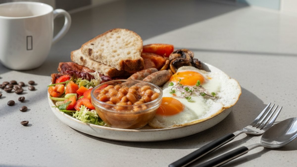 2× vejce, fazole, vepřová klobása, slanina, žampiony, rajče, chléb