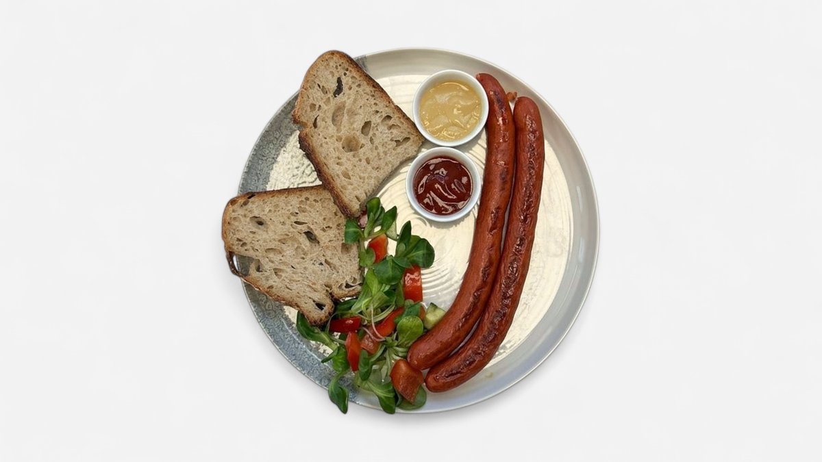 2× párek, hořčice, kečup, řemeslný chléb