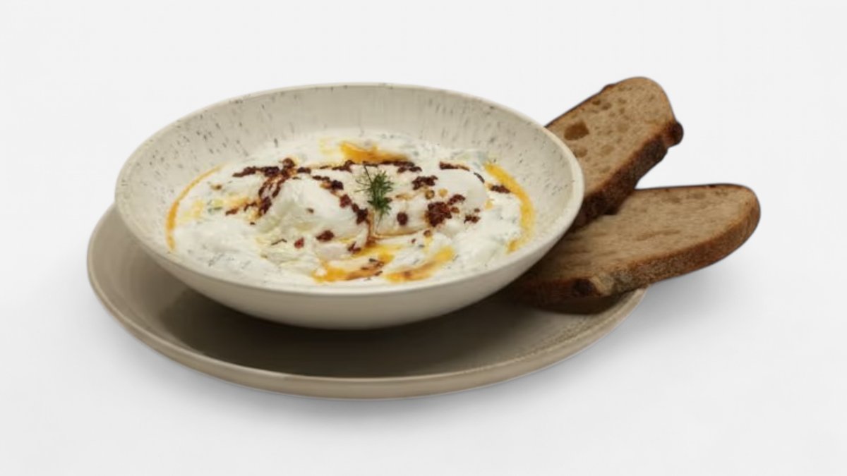 Dvě pošírovaná vejce, řecký jogurt, česnek, máslo, chilli vločky, kopr a chléb