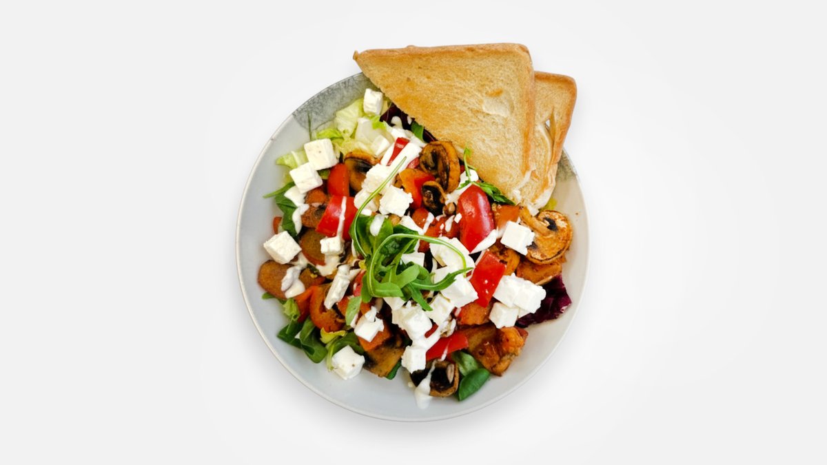 Zelný salát, grilovaná zelenina, balkánský sýr, oříšky, zálivka, toustový chléb