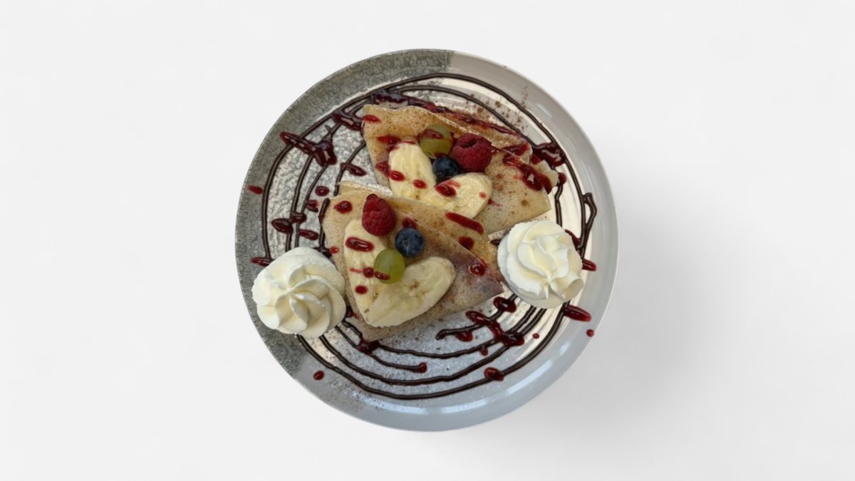 Dvě palačinky, džem, čokoláda, ovoce, šlehačka