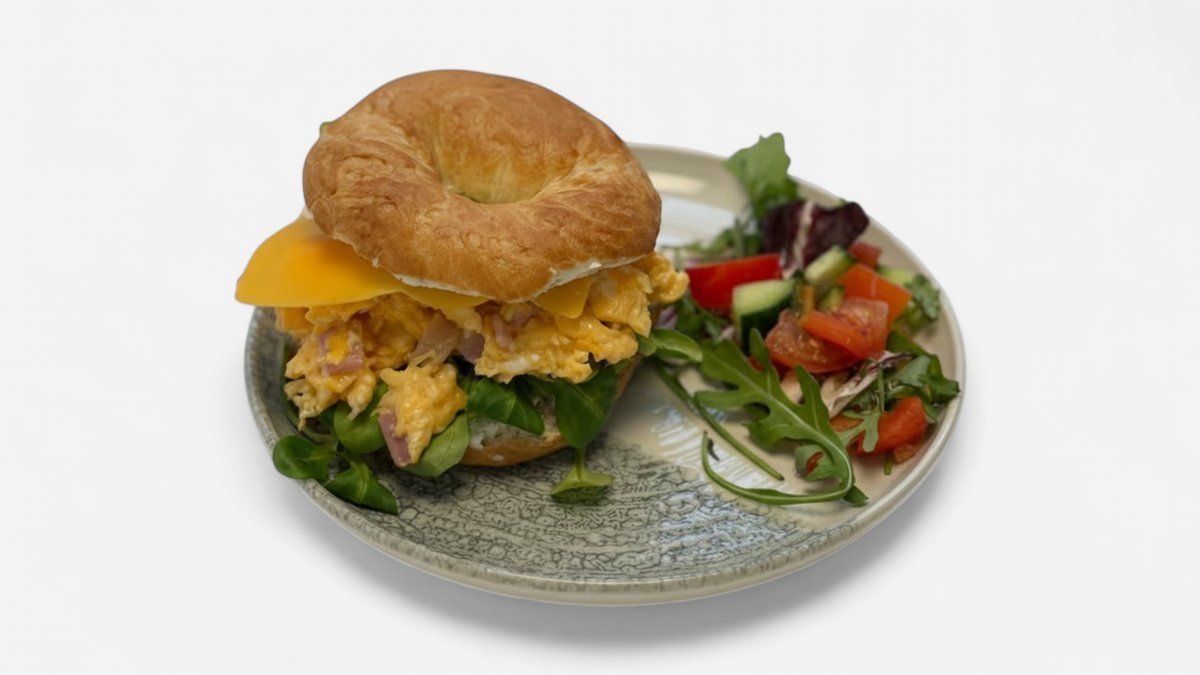 Bagel, míchané vejce, pomazánkové máslo, slanina, salát, rajče, čedar