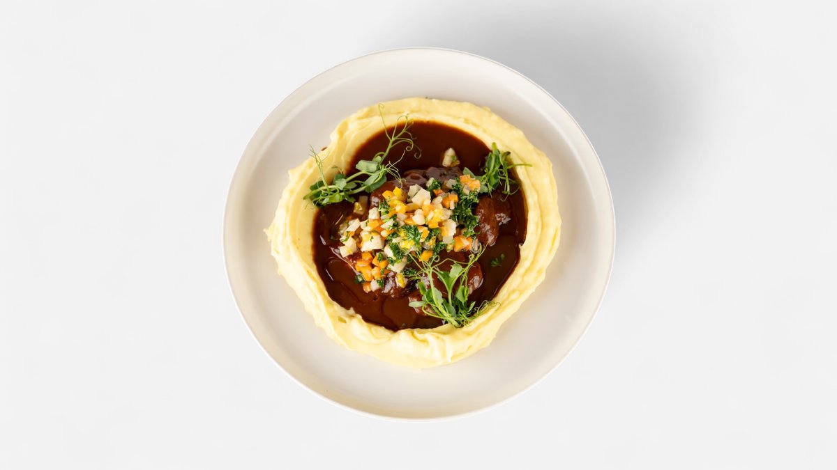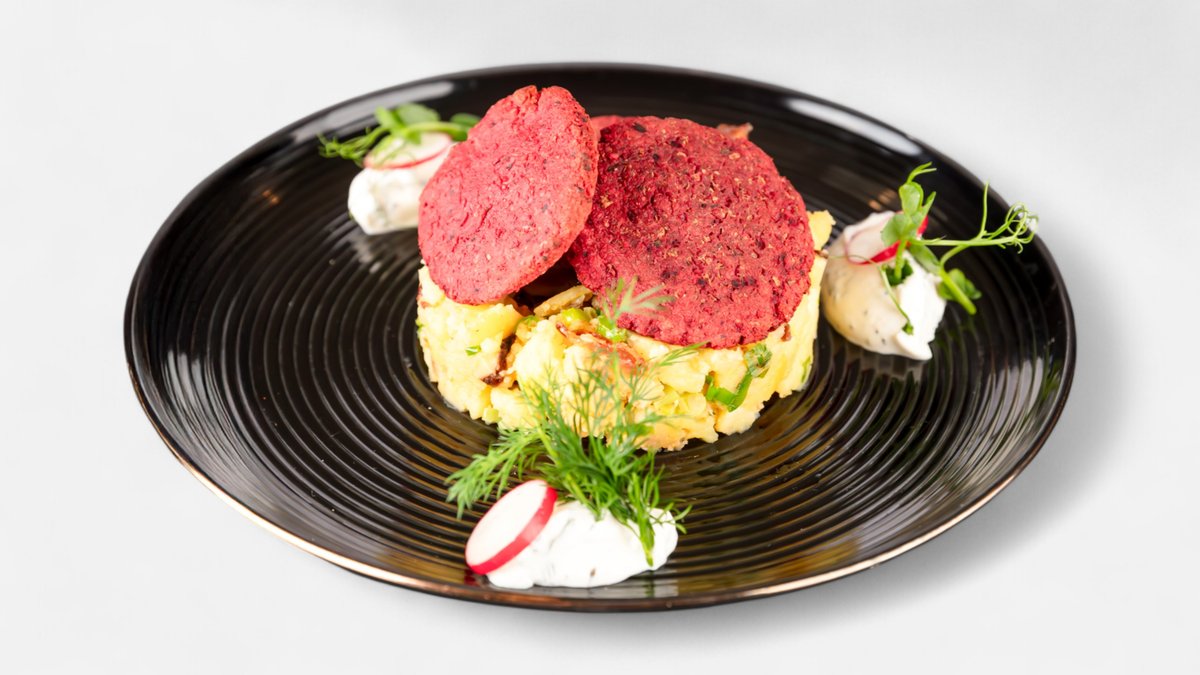mačkané brambory s bylinkami, smažená cibule, pažitkový dip, výhonky z biofarmy A:1,3,7