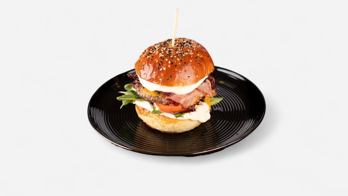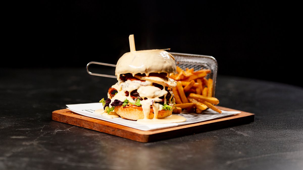 hovězí Black Angus plněný cheddarem v naší housce chipotle majonéza, vypečená slanina, volské oko, cibulové kroužky, salát, rajče, cibule, steakové hranolky se slupkou /A:1,3,7,11