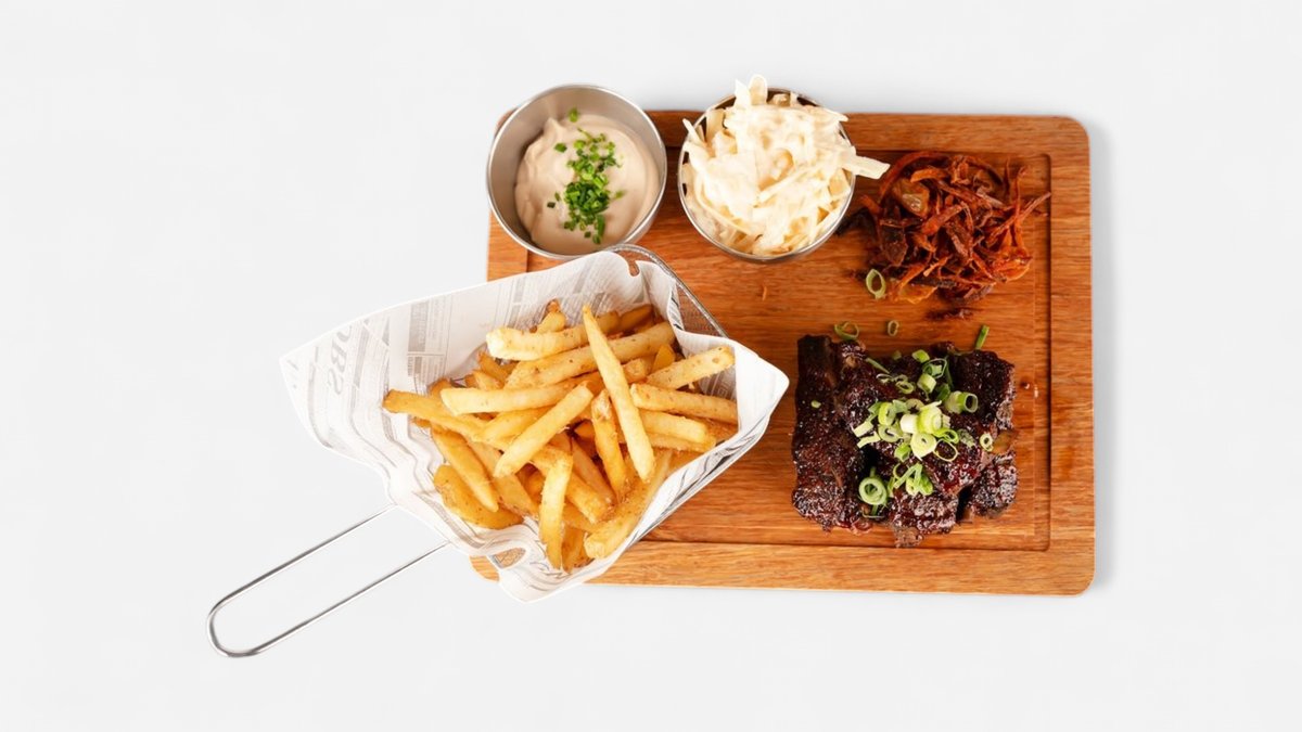 uzená majonéza, sýr cheddar, cibulová remuláda, salát, rajče, vypečená slanina, steakové hranolky A:1,3,7,11