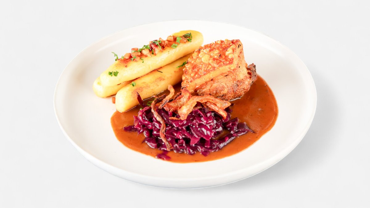 červené zelí, opečené bramborové špalíky, vídeňská cibulka, vepřový výpek A:1,3,7