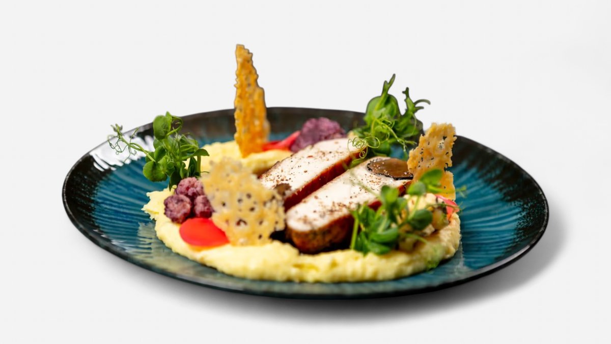 bramborové pyré provoněné lanýžem, omáčka z Madeiry a demi glace, grilovaný barevný květák, lanýž, parmazánový chips A:1