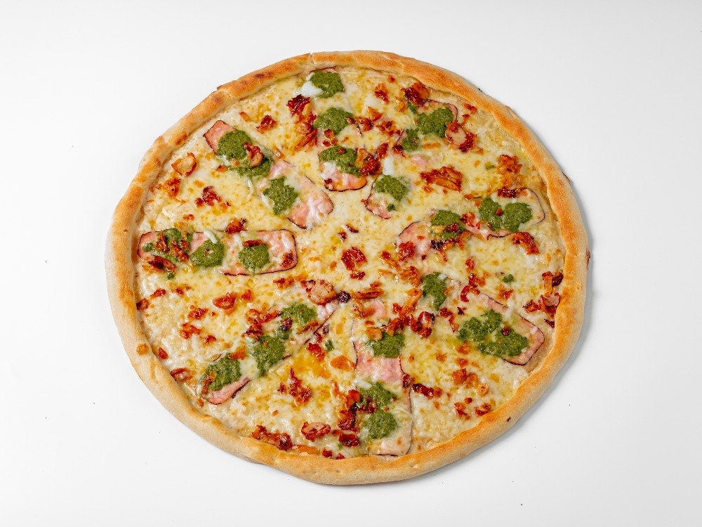 rajčata-sugo, mozzarella, šunka, slanina, uzený sýr, niva, cibule, smetana