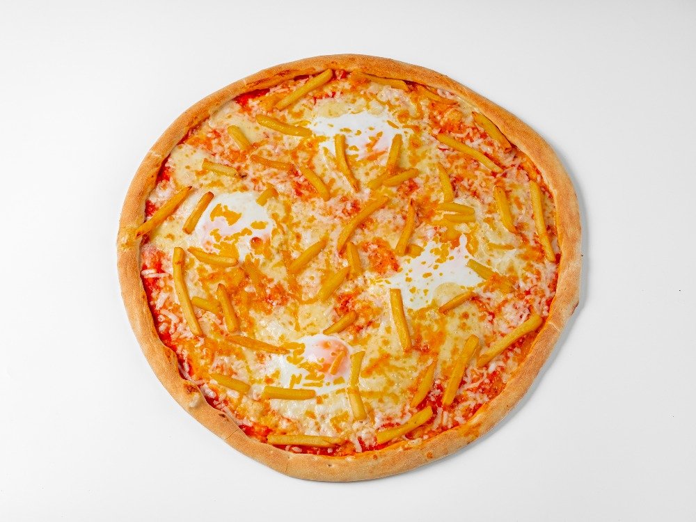 rajčata-sugo, mozzarella, šunka, salám, uzený sýr, kukuřice, paprika, chilli