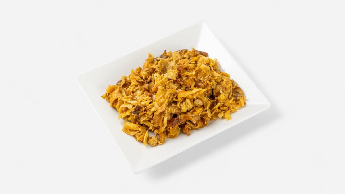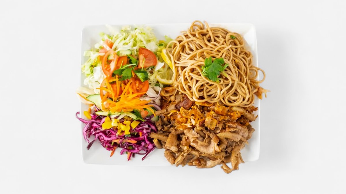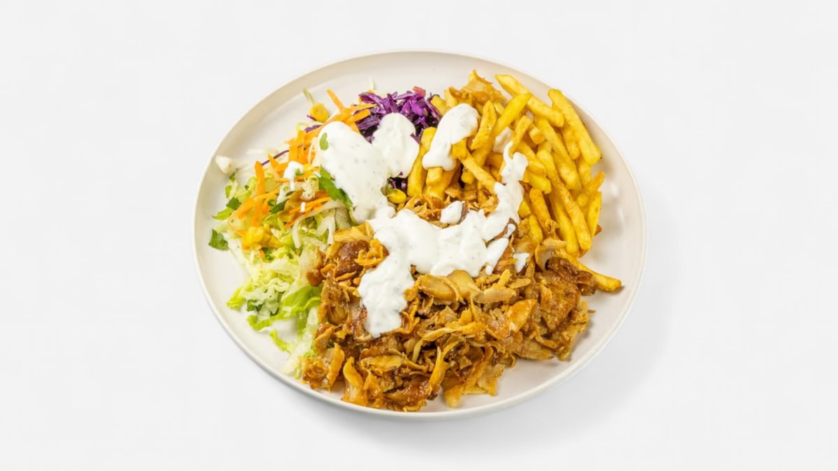 maso, salát, omáčka, turecký chléb nebo hranolky nebo nudle