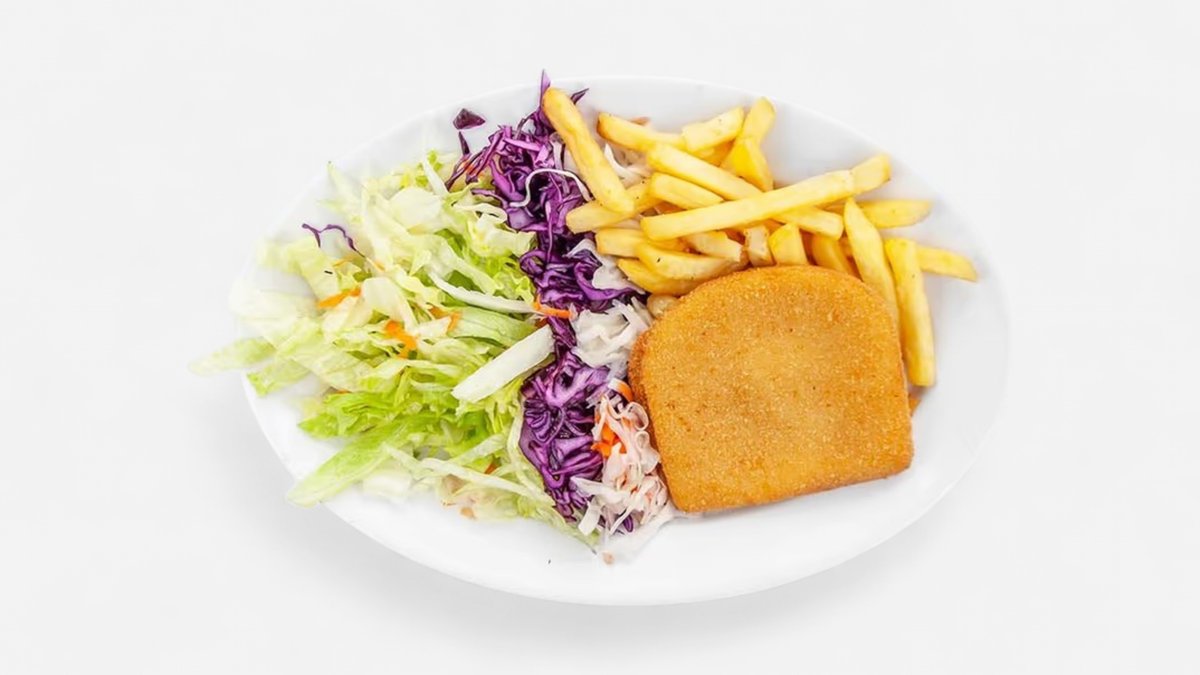 3 ks kuřecího masa, salát, hranolky, omáčka